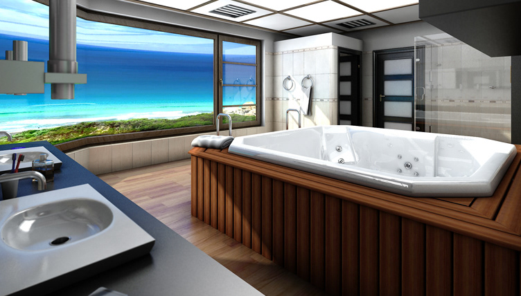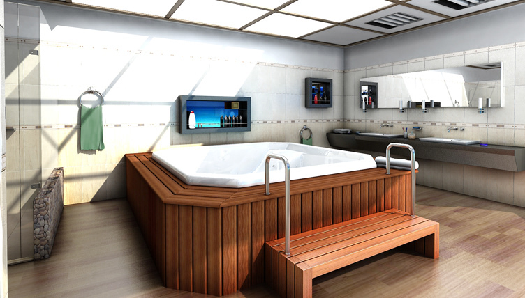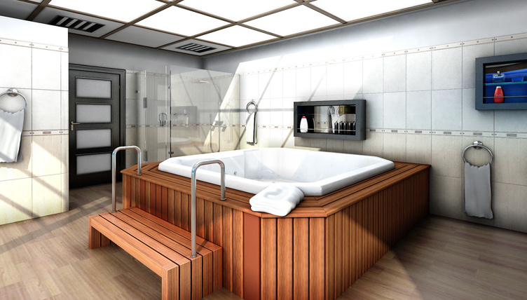 Muestra de modelo Jacuzzi Galaxia, 2 mts X 2 mts, soporte en deck de madera, en espacio virtual